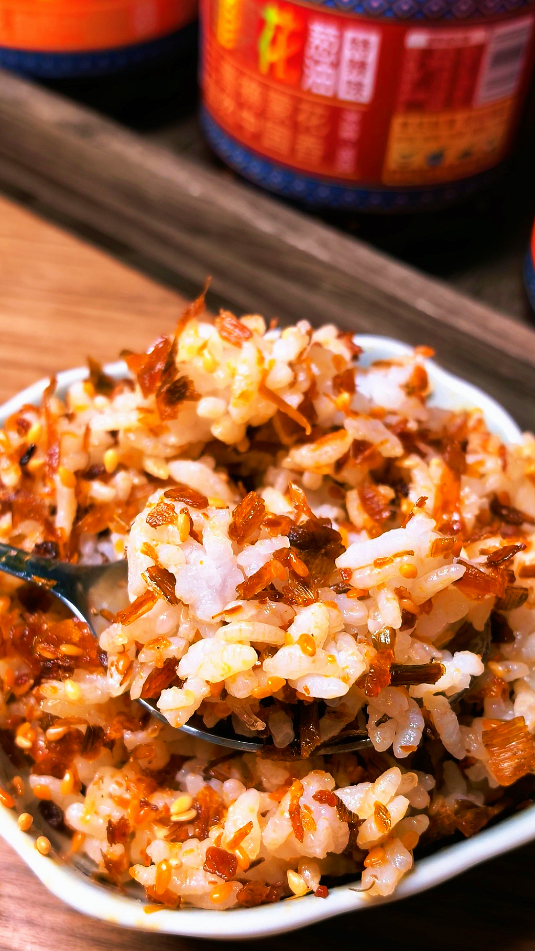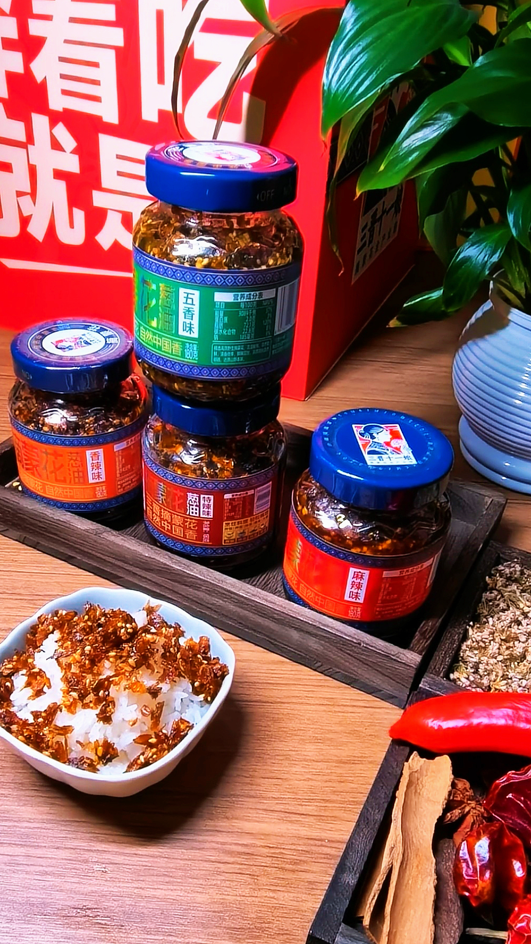 摘蒙花葱油(香辣味)定位为辣而不燥、香而不腻的开胃型葱油,针对不耐受高辣度但追求香辣口感的食客。其配料包含菜籽油、大豆油、摘蒙花、红葱、洋葱、辣椒面、生姜、大蒜、芝麻、花椒、八角、食用盐,规格为180g(线下)、80g(线上)。